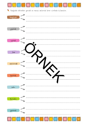 Aşağıdaki kelimeleri gerçek ve mecaz anlamda birer cümlede kullanalım. bayılmak yüzmek uçmak boş sürünmek ÖRNEK kurmak sulu buruştu yanmak 30