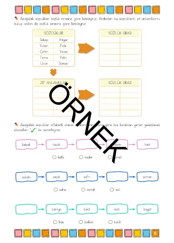 Aşağıdaki sözcükleri sözlük sırasına göre listeleyiniz. Ardından bu sözcüklerin zıt anlamlılarını