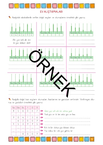 Aşağıdaki abaküslerde verilen doğal sayıları ve okunuşlarını örnekteki gibi yazınız.