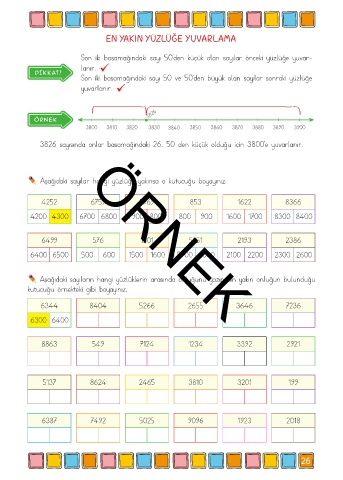 3826 sayısında onlar basamağındaki 26, 50 den küçük olduğu için 3800’e yuvarlanır.