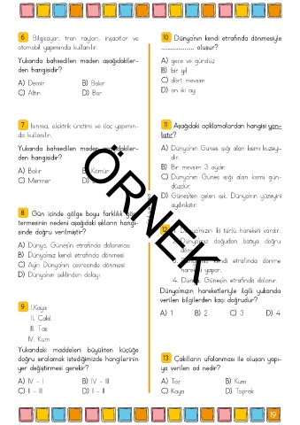 C) Mermer D) Bor C) Dünya’nın Güneş ışığı alan kısmı gün-