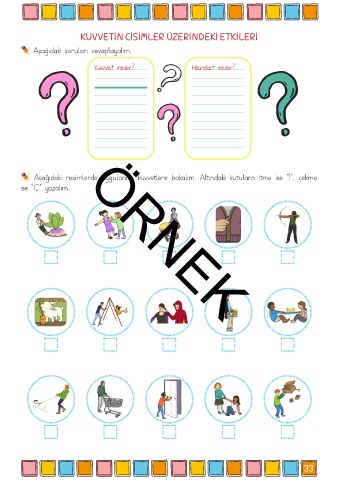 KUVVETİN CİSİMLER ÜZERİNDEKİ ETKİLERİ Aşağıdaki soruları cevaplayalım. Kuvvet nedir? Hareket nedir? Aşağıdaki resimlerde uygulanan kuvvetlere bakalım. Altındaki kutulara itme ise “İ”, çekme ise “Ç” yazalım. ÖRNEK 33
