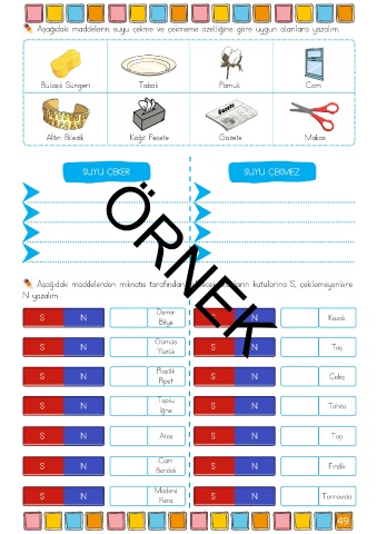 Aşağıdaki maddelerden mıknatıs tarafından çekilecek olanların kutularına S, çekilemeyenlere