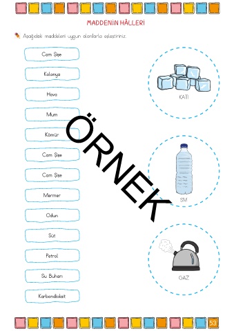 MADDENİN HÂLLERİ Aşağıdaki maddeleri uygun alanlarla eşleştiriniz. Cam Şişe Kolonya Hava KATI Mum Kömür Cam Şişe Cam Şişe Mermer ÖRNEK SIVI Odun Süt Petrol Su Buharı GAZ Karbondioksit 53