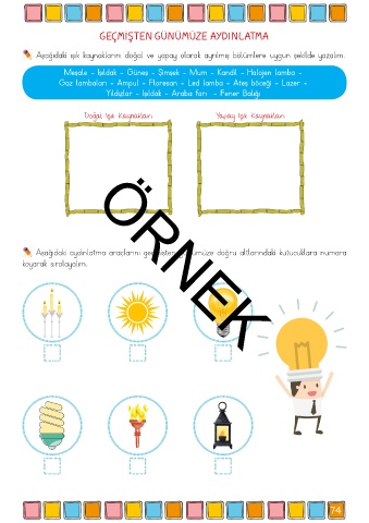 Aşağıdaki ışık kaynaklarını doğal ve yapay olarak ayrılmış bölümlere uygun şekilde yazalım.