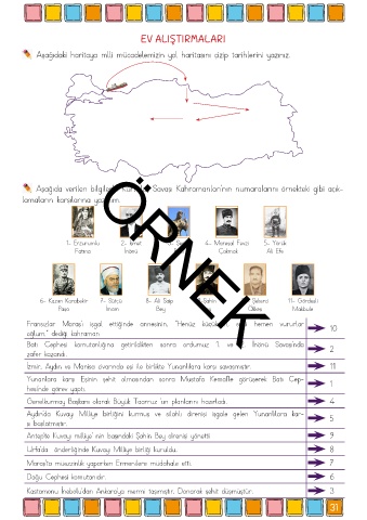 Aşağıda verilen bilgilerle Kurtuluş Savaşı Kahramanları’nın numaralarını örnekteki gibi açık-
