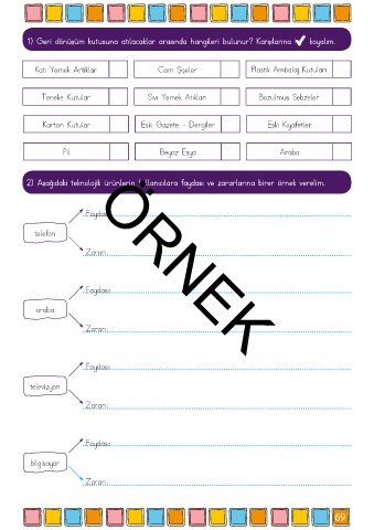 1) Geri dönüşüm kutusuna atılacaklar arasında hangileri bulunur? Karşılarına koyalım.