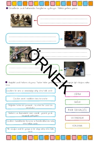 Aşağıdaki çocuk haklarını okuyunuz. Yazılan hakkın yandaki kavramlardan hangisiyle ilgili olduğunu eşleş-