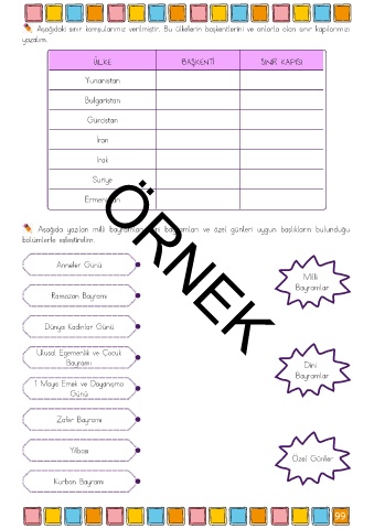 Aşağıda yazılan milli bayramları, dini bayramları ve özel günleri uygun başlıkların bulunduğu