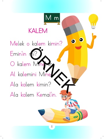 M m KALEM Melek o kalem kimin? Emin’in mi? O kalem Mine’nin. Al kalemini Mine. Ala kalem kimin? ÖRNEK Ala kalem Kemal’in. 8