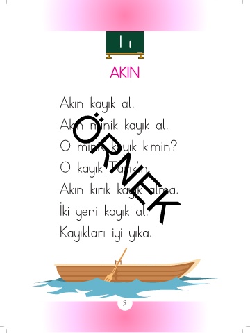I ı AKIN Akın kayık al. Akın minik kayık al. O minik kayık kimin? O kayık Tarık’ın. Akın kırık kayık alma. ÖRNEK İki yeni kayık al. Kayıkları iyi yıka. 9