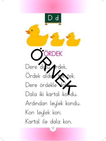 D d ÖRDEK Dere dolu ördek, Ördek aldım tek tek. Dere ördekle doldu. ÖRNEK Dala iki kartal kondu. Ardından leylek kondu. Kon leylek kon. Kartal ile dala kon. 10