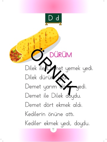 D d DÜRÜM Dilek ile Demet yemek yedi. Dilek dürüm yedi. Demet yarım döner yedi. ÖRNEK Demet ile Dilek doydu. Demet dört ekmek aldı. Kedilerin önüne attı. Kediler ekmek yedi, doydu. 11