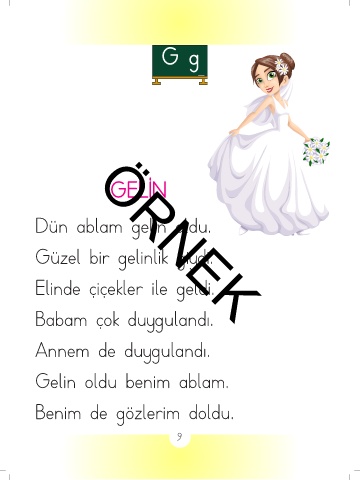 G g GELİN Dün ablam gelin oldu. Güzel bir gelinlik giydi. Elinde çiçekler ile geldi. ÖRNEK Babam çok duygulandı. Annem de duygulandı. Gelin oldu benim ablam. Benim de gözlerim doldu. 9