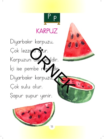 P p KARPUZ Diyarbakır karpuzu, Çok lezzetli olur. Karpuzun dışı yeşildir. İçi ise pembe renklidir. Diyarbakır karpuzu, ÖRNEK Çok sulu olur. Şapur şupur yenir. 18