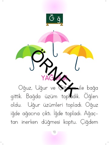 Ğ ğ YAĞMUR Oğuz, Uğur ve Çiğdem ile bağa ÖRNEK gittik. Bağda üzüm topladık. Öğlen oldu. Uğur üzümleri topladı. Oğuz iğde ağacına çıktı. İğde topladı. Ağaç- tan inerken düğmesi koptu. Çiğdem 10