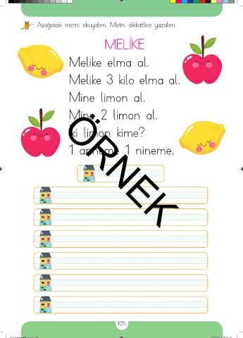 Aşağıdaki metni okuyalım. Metni dikkatlice yazalım. MELİKE Melike elma al. Melike 3 kilo elma al. Mine limon al. Mine 2 limon al. İki limon kime? 1 anneme 1 nineme. ÖRNEK 105 taslak dosyabitti3.indd 105 29.07.2019 02:02:15