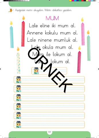 Aşağıdaki metni okuyalım. Metni dikkatlice yazalım. MUM Lale eline iki mum al. Annene kokulu mum al. Lale ninene mumluk al. Lale okula mum al. Mum ile lokum al. Lale 5 lokum al. ÖRNEK 119 taslak dosyabitti3.indd 119 29.07.2019 02:03:39
