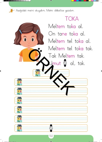 Aşağıdaki metni okuyalım. Metni dikkatlice yazalım. TOKA Meltem toka al. On tane toka al. Meltem tel toka al. Meltem tel toka tak. Tak Meltem tak. Umut al, tak. ÖRNEK 132 taslak dosyabitti3.indd 132 29.07.2019 02:04:47
