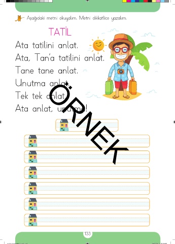 Aşağıdaki metni okuyalım. Metni dikkatlice yazalım. TATİL Ata tatilini anlat. Ata, Tan’a tatilini anlat. Tane tane anlat. Unutma anlat. Tek tek anlat. Ata anlat, unutma! ÖRNEK 133 taslak dosyabitti3.indd 133 29.07.2019 02:04:49
