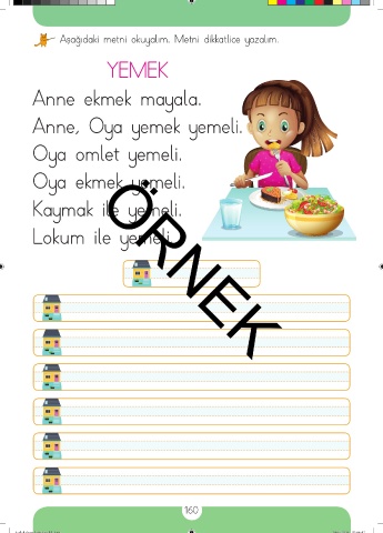 Aşağıdaki metni okuyalım. Metni dikkatlice yazalım. YEMEK Anne ekmek mayala. Anne, Oya yemek yemeli. Oya omlet yemeli. Oya ekmek yemeli. Kaymak ile yemeli. Lokum ile yemeli. ÖRNEK 160 taslak dosyabitti3.indd 160 29.07.2019 02:06:47