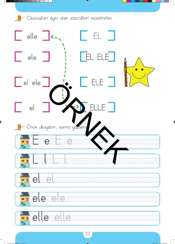 Okunuşları aynı olan sözcükleri eşleştirelim. elle EL ele EL ELE el ele ELE el ELLE Önce okuyalım, sonra yazalım. E e E e ÖRNEK L l L l el el ele ele elle elle 23 taslak dosyabitti3.indd 23 29.07.2019 01:56:00