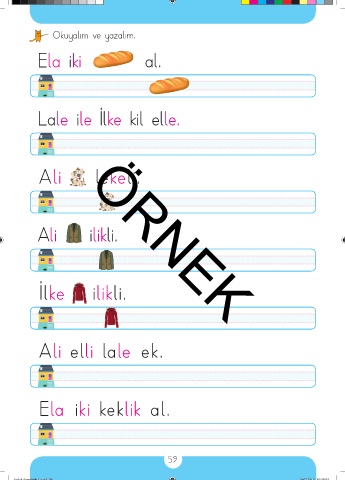 Okuyalım ve yazalım. Ela iki al. Lale ile İlke kil elle. Ali lekeli. Ali ilikli. İlke ilikli. ÖRNEK Ali elli lale ek. Ela iki keklik al. 59 taslak dosyabitti3.indd 59 29.07.2019 01:58:53