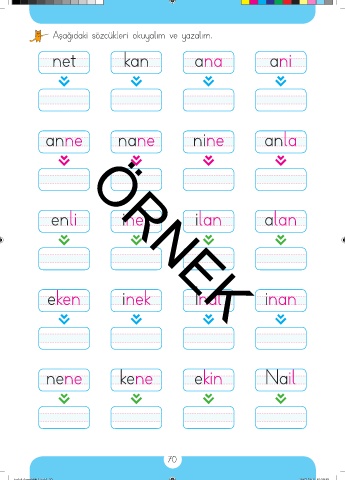 Aşağıdaki sözcükleri okuyalım ve yazalım. net kan ana ani anne nane nine anla inek alan ilan enli ÖRNEK eken inek İnal inan nene kene ekin Nail 70 taslak dosyabitti3.indd 70 29.07.2019 01:59:38