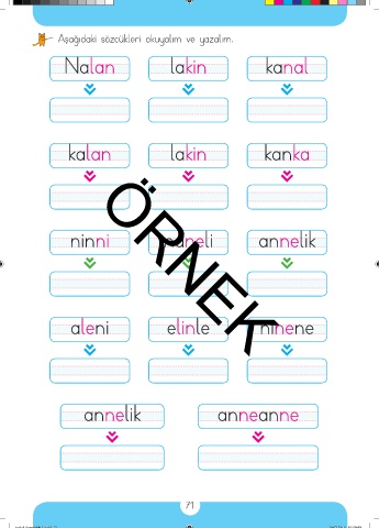 Aşağıdaki sözcükleri okuyalım ve yazalım. Nalan lakin kanal kalan lakin kanka ninni naneli annelik aleni elinle ninene ÖRNEK annelik anneanne 71 taslak dosyabitti3.indd 71 29.07.2019 01:59:40