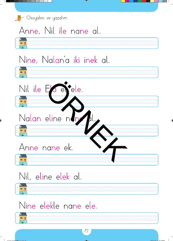 Okuyalım ve yazalım. Anne, Nil ile nane al. Nine, Nalan’a iki inek al. Nil ile Ela el ele. Nalan eline nane al. Anne nane ek. ÖRNEK Nil, eline elek al. Nine elekle nane ele. 72 taslak dosyabitti3.indd 72 29.07.2019 01:59:45