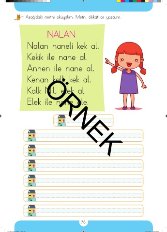 Aşağıdaki metni okuyalım. Metni dikkatlice yazalım. NALAN Nalan naneli kek al. Kekik ile nane al. Annen ile nane al. Kenan kalk kek al. Kalk Nil, elek al. Elek ile nane ele. ÖRNEK 76 taslak dosyabitti3.indd 76 29.07.2019 01:59:59