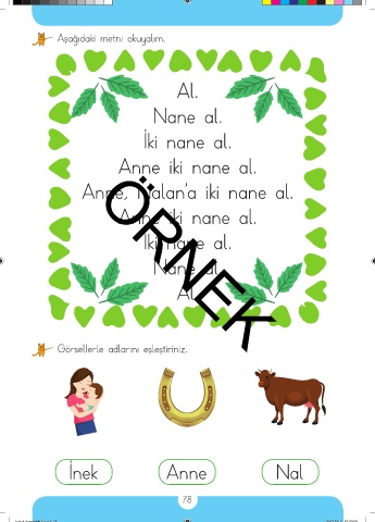 Aşağıdaki metni okuyalım. Al. Nane al. İki nane al. Anne iki nane al. Anne, Nalan’a iki nane al. Anne iki nane al. İki nane al. Nane al. Al. ÖRNEK Görsellerle adlarını eşleştiriniz. İnek Anne Nal 78 taslak dosyabitti3.indd 78 29.07.2019 02:00:08