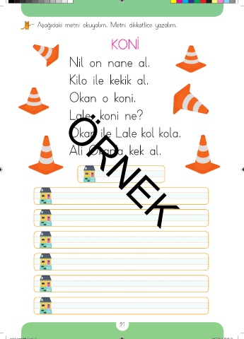 Aşağıdaki metni okuyalım. Metni dikkatlice yazalım. KONİ Nil on nane al. Kilo ile kekik al. Okan o koni. Lale, koni ne? Okan ile Lale kol kola. Ali Okan’a kek al. ÖRNEK 91 taslak dosyabitti3.indd 91 29.07.2019 02:01:15