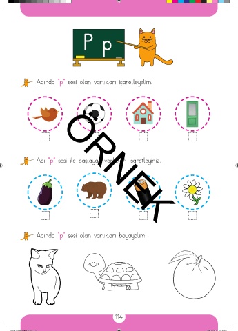 P p Adında “p” sesi olan varlıkları işaretleyelim. Adı “p” sesi ile başlayan varlıkları işaretleyiniz. ÖRNEK Adında “p” sesi olan varlıkları boyayalım. 114 taslak dosyabitti4.indd 114 29.07.2019 01:35:02