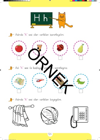 H h Adında “h” sesi olan varlıkları işaretleyelim. Adı “h” sesi ile başlayan varlıkları işaretleyiniz. ÖRNEK Adında “h” sesi olan varlıkları boyayalım. 124 taslak dosyabitti4.indd 124 29.07.2019 01:36:11
