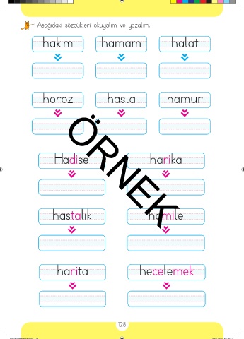 Aşağıdaki sözcükleri okuyalım ve yazalım. hakim hamam halat horoz hasta hamur Hadise harika ÖRNEK hastalık hamile harita hecelemek 128 taslak dosyabitti4.indd 128 29.07.2019 01:36:22