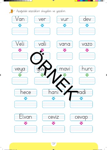Aşağıdaki sözcükleri okuyalım ve yazalım. Van ver vur dev Veli vali vana vazo mavi yuva hurç veya ÖRNEK hece hani vadi Elvan ceviz cevap 137 taslak dosyabitti4.indd 137 29.07.2019 01:37:44
