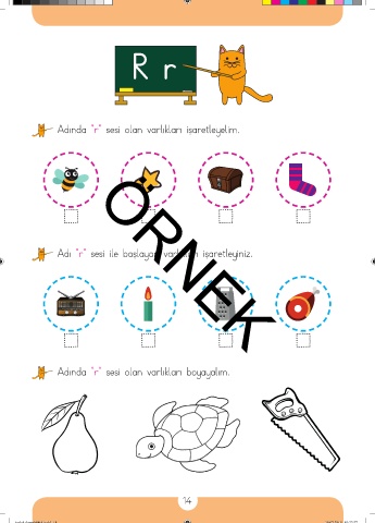 R r Adında “r” sesi olan varlıkları işaretleyelim. Adı “r” sesi ile başlayan varlıkları işaretleyiniz. ÖRNEK Adında “r” sesi olan varlıkları boyayalım. 14 taslak dosyabitti4.indd 14 29.07.2019 01:22:27