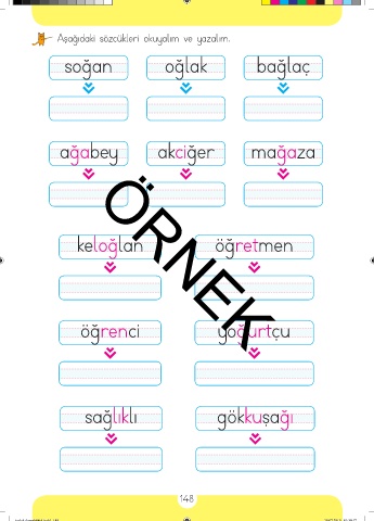 Aşağıdaki sözcükleri okuyalım ve yazalım. soğan oğlak bağlaç ağabey akciğer mağaza keloğlan öğretmen ÖRNEK öğrenci yoğurtçu sağlıklı gökkuşağı 148 taslak dosyabitti4.indd 148 29.07.2019 01:39:17