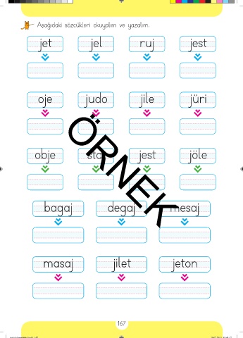 Aşağıdaki sözcükleri okuyalım ve yazalım. jet jel ruj jest oje judo jile jüri staj jest obje ÖRNEK jöle bagaj degaj mesaj masaj jilet jeton 167 taslak dosyabitti4.indd 167 29.07.2019 01:41:17