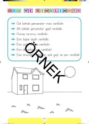 Evin önündeki çimenler açık yeşil ve sarı renklidir.