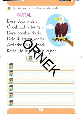 Aşağıdaki metni okuyalım. Metni dikkatlice yazalım. KARTAL Dere dolu ördek, Ördek aldım tek tek. Dere ördekle doldu. Dala iki kartal kondu. Ardından leylek kondu. Kartal ile leylek oyun oynadı. ÖRNEK 41 taslak dosyabitti4.indd 41 29.07.2019 01:25:32