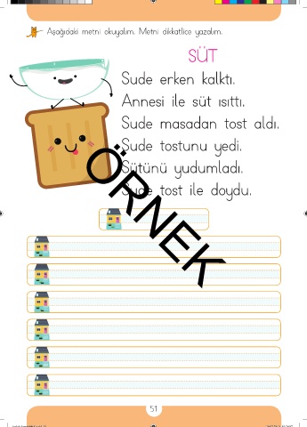 Aşağıdaki metni okuyalım. Metni dikkatlice yazalım. SÜT Sude erken kalktı. Annesi ile süt ısıttı. Sude masadan tost aldı. Sude tostunu yedi. Sütünü yudumladı. Sude tost ile doydu. ÖRNEK 51 taslak dosyabitti4.indd 51 29.07.2019 01:26:57