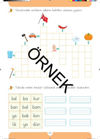 Görsellerdeki varlıkların adlarını belirtilen alanlara yazalım. ÖRNEK Tabloda verilen heceleri kullanarak anlamlı sözcükler oluşturalım. kal ba kur ban bal bam ya bak kon lık ya dün 60 taslak dosyabitti4.indd 60 29.07.2019 01:28:16