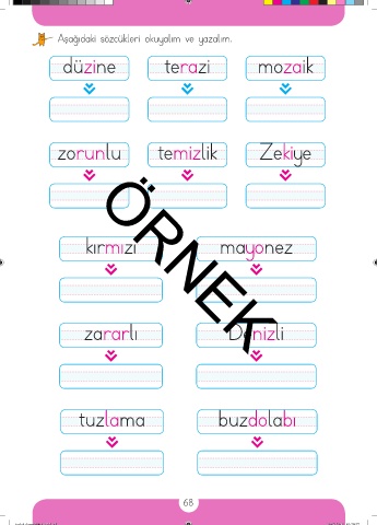 Aşağıdaki sözcükleri okuyalım ve yazalım. düzine terazi mozaik zorunlu temizlik Zekiye kırmızı mayonez ÖRNEK zararlı Denizli tuzlama buzdolabı 68 taslak dosyabitti4.indd 68 29.07.2019 01:29:27
