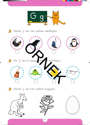 G g Adında “g” sesi olan varlıkları işaretleyelim. Adı “g” sesi ile başlayan varlıkları işaretleyiniz. ÖRNEK Adında “g” sesi olan varlıkları boyayalım. 84 taslak dosyabitti4.indd 84 29.07.2019 01:31:45