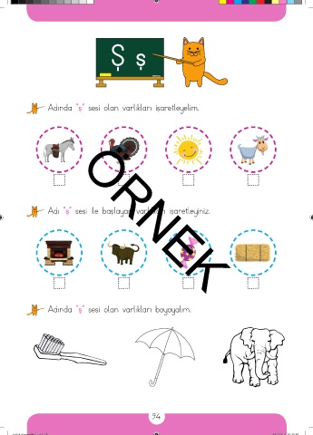 Ş ş Adında “ş” sesi olan varlıkları işaretleyelim. Adı “ş” sesi ile başlayan varlıkları işaretleyiniz. ÖRNEK Adında “ş” sesi olan varlıkları boyayalım. 94 taslak dosyabitti4.indd 94 29.07.2019 01:32:38