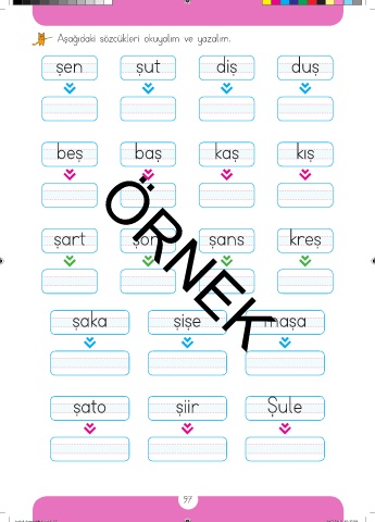 Aşağıdaki sözcükleri okuyalım ve yazalım. şen şut diş duş beş baş kaş kış şort şans şart ÖRNEK kreş şaka şişe maşa şato şiir Şule 97 taslak dosyabitti4.indd 97 29.07.2019 01:32:50