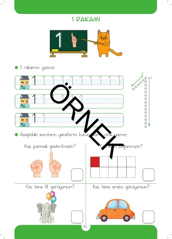1 rakamı 1 1 1 rakamını yazınız. 1 1 1 1 1 1 1 1 1 1 1 1 1 1 1 1 1 1 1 1 ÖRNEK Aşağıdaki soruların yanıtlarını kutucukların içine yazınız. Kaç parmak gösterilmiştir? Kaç kutu boyanmıştır? Kaç tane fil görüyorsun? Kaç tane araba görüyorsun? 14