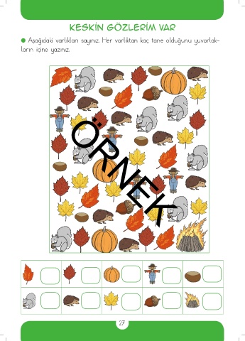keskin gözlerim var Aşağıdaki varlıkları sayınız. Her varlıktan kaç tane olduğunu yuvarlak- ların içine yazınız. ÖRNEK 27